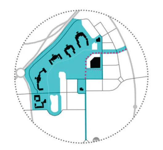 Gestion des eaux pluviales du quartier par un plan d’eau permanent avec expansion occasionnelle sur plaine de jeux.