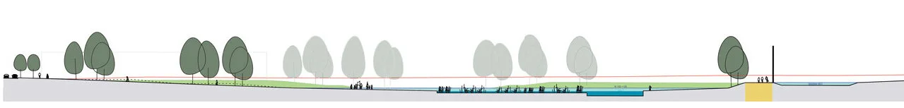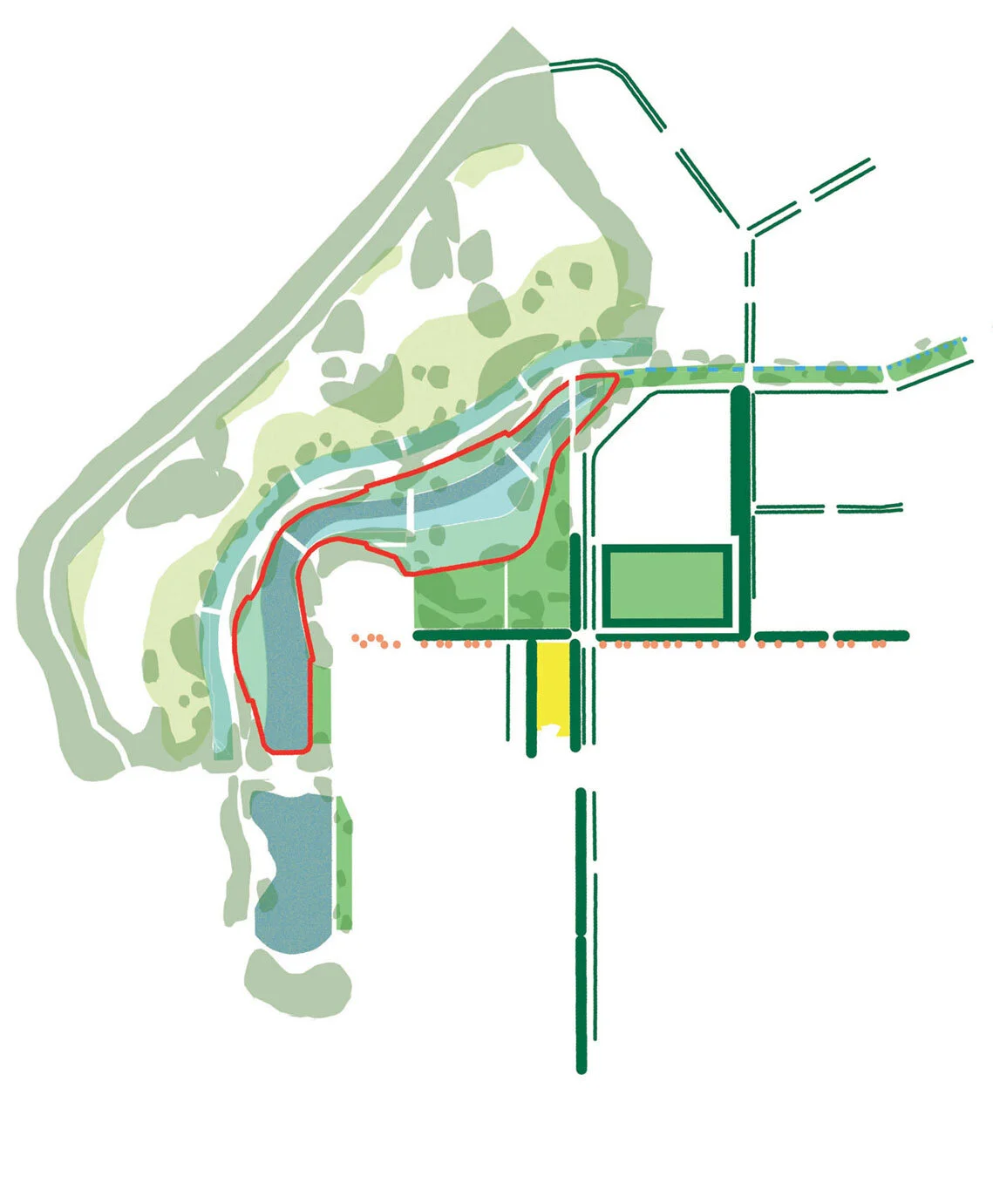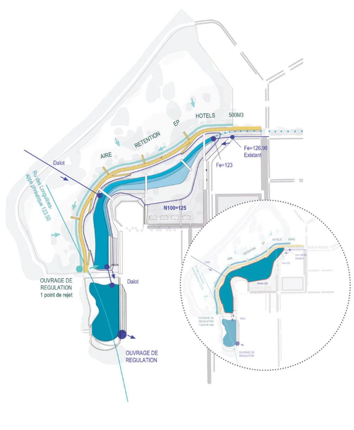 - Les bassins de stockage, qui sous-tendent l’organisation des parcs de la ville nouvelle, sont généralement encaissés et séparés du territoire et de la ville par des talus «paysagers» de faible valeur d’usage. Des propositions permettant de faire affleurer le parc au niveau de la ville, tout en accueillant les 50 000m3 d’eau à stocker ont été recherchées,